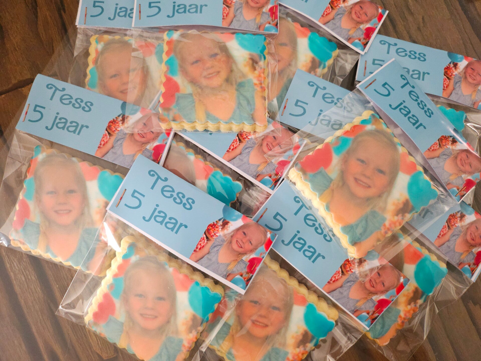 Traktatie koeken met foto naar wens, de koekjes zullen mooi worden afgewerkt met toefjes in een kleur die mooi bij de foto past.